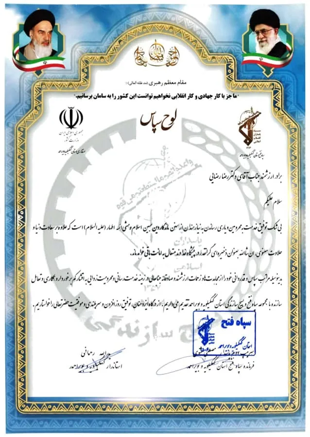 این لوح همچنین بر «قدردانی از زحمات ارزشمند جنابعالی در خدمترسانی به اقشار کمبرخوردار و همکاری سازنده با مجموعه سپاه فتح و بسیج سازندگی استان» تأکید کرده است.